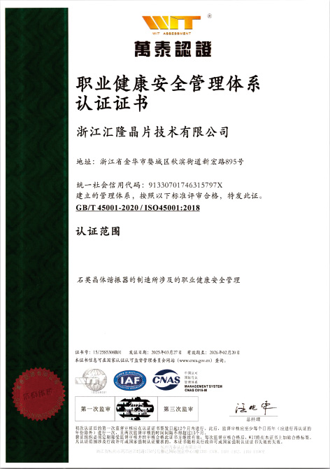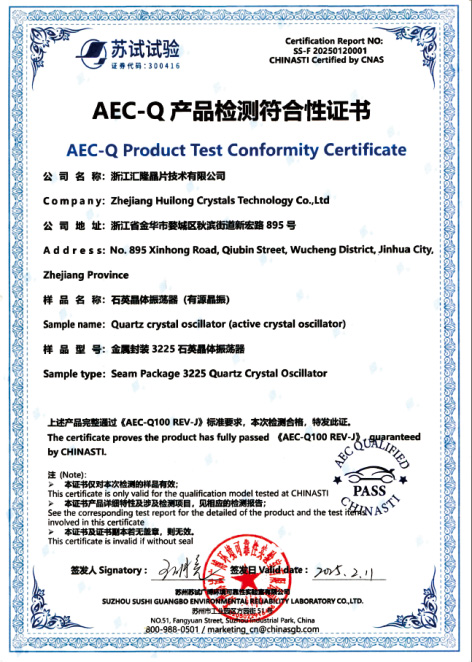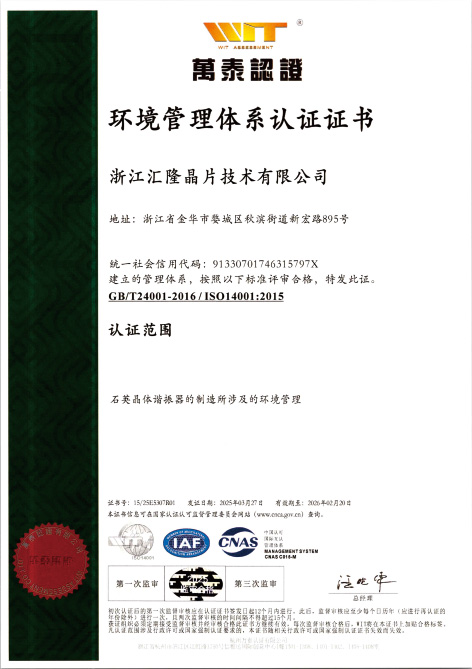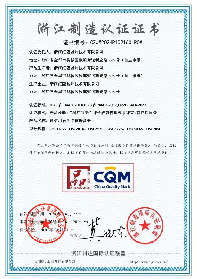 Zhejiang Huilong Crystal Technology Co., Ltd., yang ditubuhkan pada tahun 1998, mempunyai kawasan pembinaan seluas 50,431 meter persegi dan modal berdaftar sebanyak 50 juta yuan. Ia merupakan perusahaan berteknologi tinggi yang mengkhusus dalam reka bentuk, pembuatan dan penjualan resonator kristal kuarza, pengayun kristal kuarza dan cip frekuensi kristal kuarza.